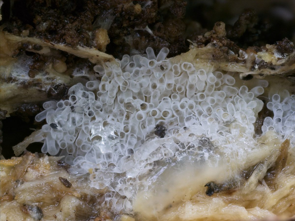 Two clusters of Arcyria cinerea at different stages of maturity (more mature in back).