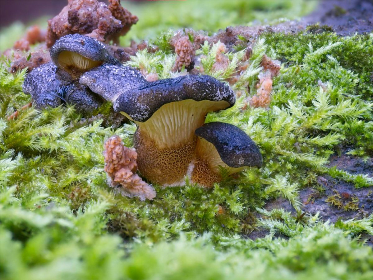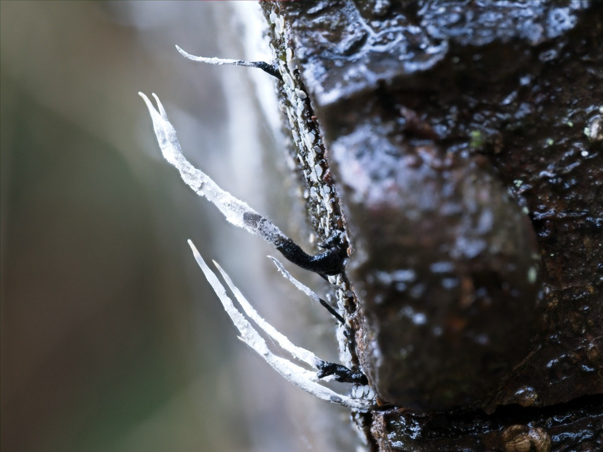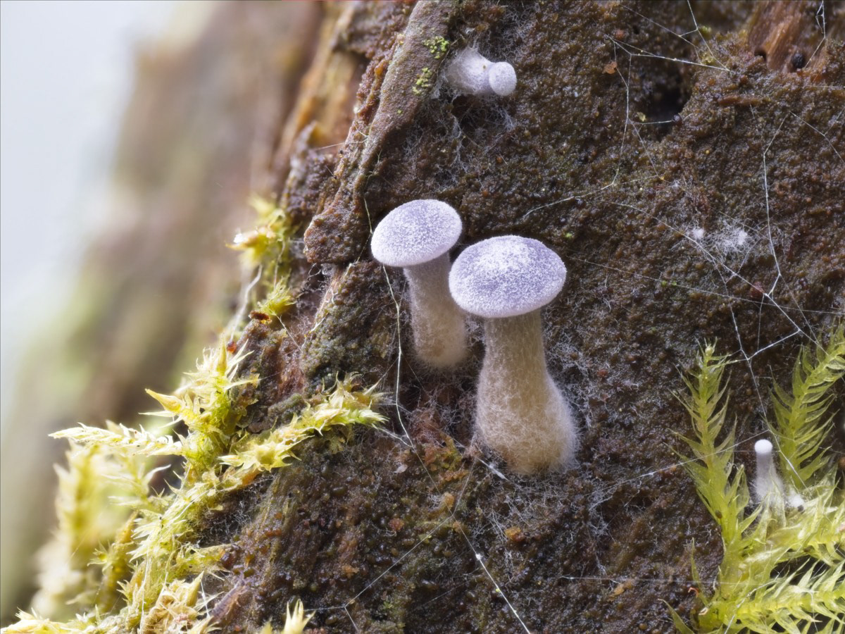 Two clusters of Arcyria cinerea at different stages of maturity (more mature in back).