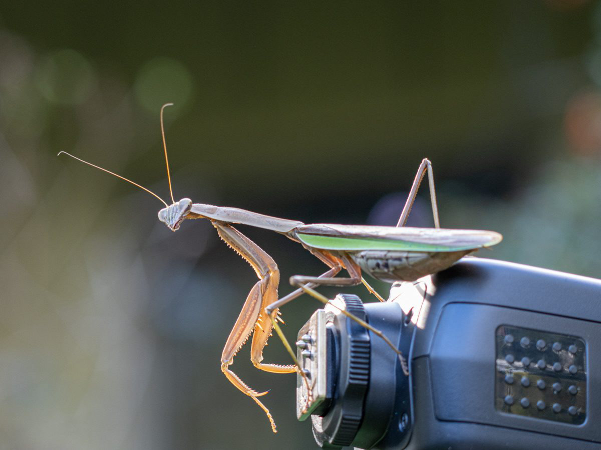I had a day where I wasn’t feeling very energetic (post Covid booster) and so I was able to stand behind my camera for an hour or so and watch a preying mantis.  If I had been feeling good I would not have had the patience.  But between the covid shot and not being able to play the viola due to my shoulder I was enabled to stand and watch for a long time while nothing happened.  Which to say no prey come by for the preying mantis.  But it did seem to be keeping an eye on me.  I tried a shot from the side and it turned and looked straight at me.  I was close at that point and decided to move further away lest I disturb the creature and prevent it from getting a meal.  That’s when the hour or more wait started.