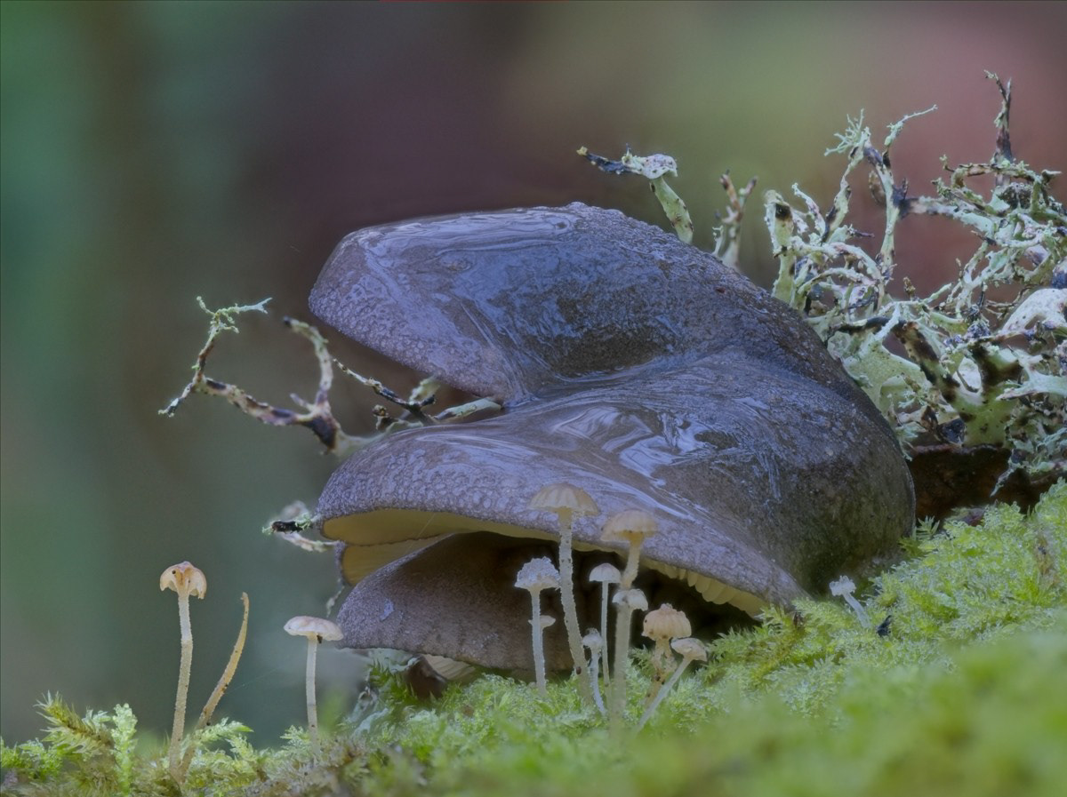 Two clusters of Arcyria cinerea at different stages of maturity (more mature in back).